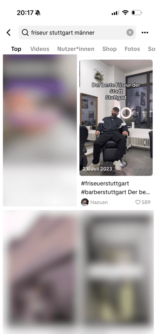 Ich gab "Stuttgart Friseur" ein und fand ein Video von Hazuan vom Babylon. Ein kurzes Videos zeigte genau das, was ich sehen wollte, erstellt im Juli 2023. In wenigen Minuten war die Entscheidung klar und am nächsten Tag saß ich im Stuhl. Seitdem gehe ich nur noch zu ihm und viele in Stuttgart machen es ähnlich.
