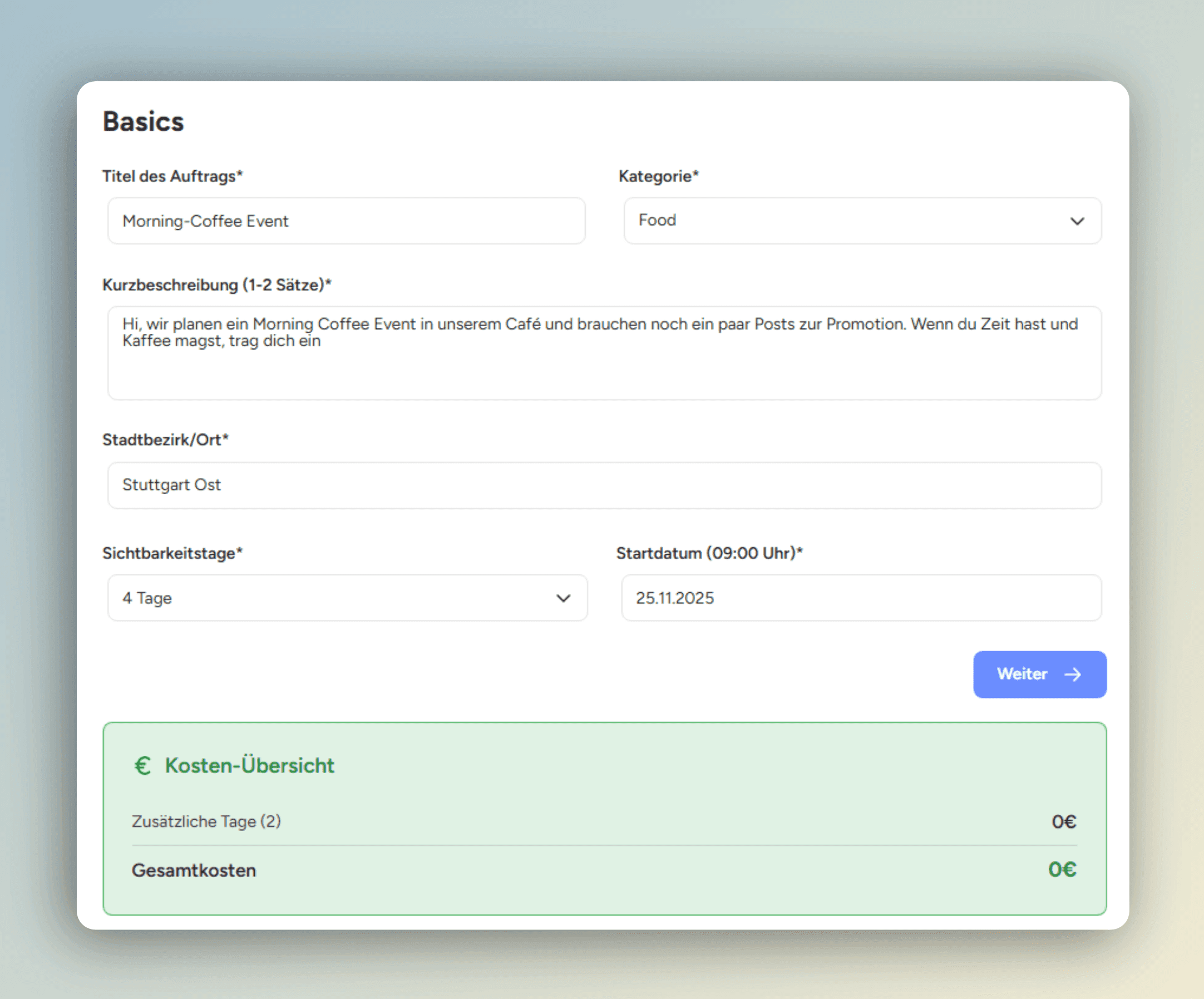 Titel, Ort und kurze Beschreibung eintragen. Sichtbarkeit wählen und den Preis sofort sehen.