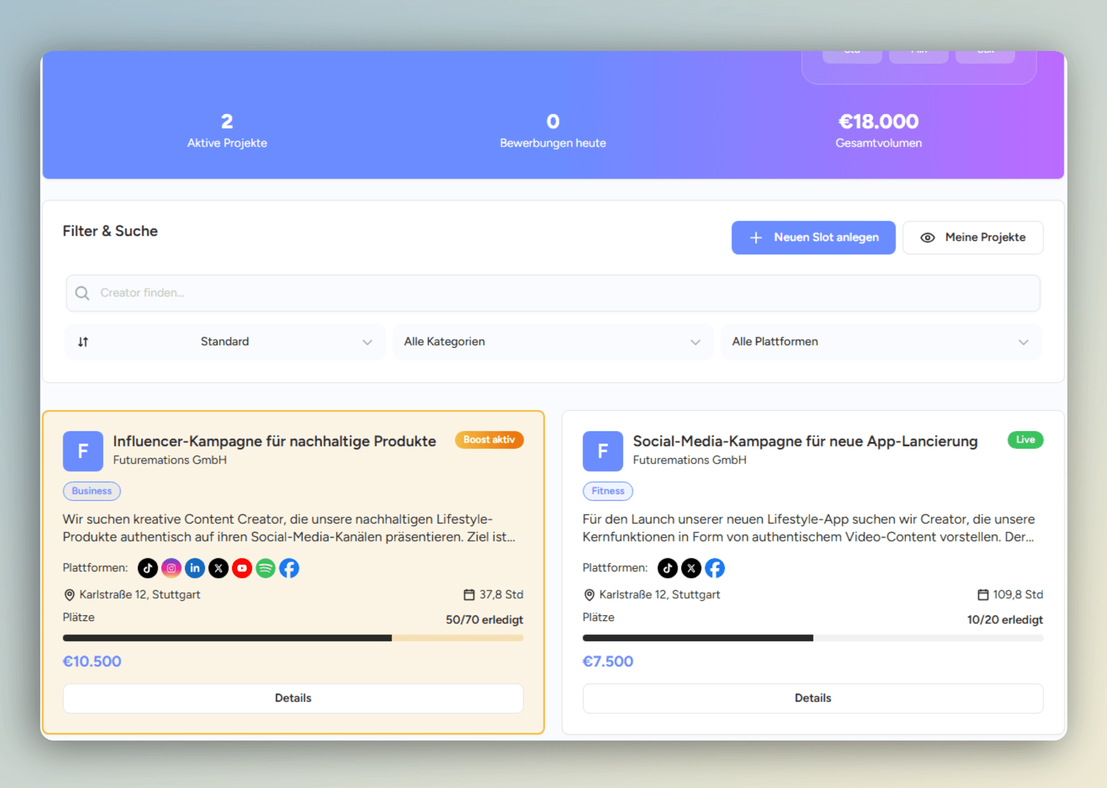 Der Wochenmarkt ist ein Bereich auf StuggiCreators, in dem lokale Unternehmen ihre Aufträge für Videos und Bilder einstellen. Für einen festen Zeitraum können sich passende Creator aus Stuttgart darauf eintragen und Content anbieten. So finden zum Beispiel Cafés Creator für ein neues Menü Video oder Fitnessstudios Leute für kurze Clips aus dem Studio.